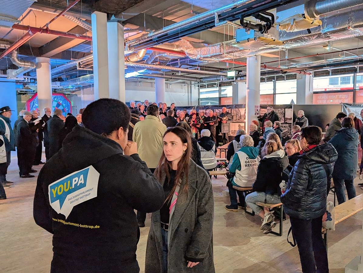 Unter dem Motto „Menschenrechte für alle“ kamen – unter der Schirmherrschaft von Oberbürgermeister Matthias Buschfeld – zahlreiche Bürgerinnen und Bürger, Vertreter*innen der Stadt, Initiativen und Studierende zusammen, um gemeinsam Haltung gegen Diskriminierung und Ausgrenzung zu zeigen. Musikalisch begleitet wurde die Aktion von der Aktionsgemeinschaft Bottroper Chöre.