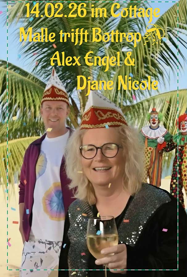 Karnevalssamstag🎊 trifft auf Valentinstag😘 und im Cottage trifft Malle (Alex Engel) auf Bottrop (DJane Nicole). D.h. Party pur…mit und ohne Kostüm. VVK für 10€ startet am 12.01.26 an den bekannten VVKstellen.