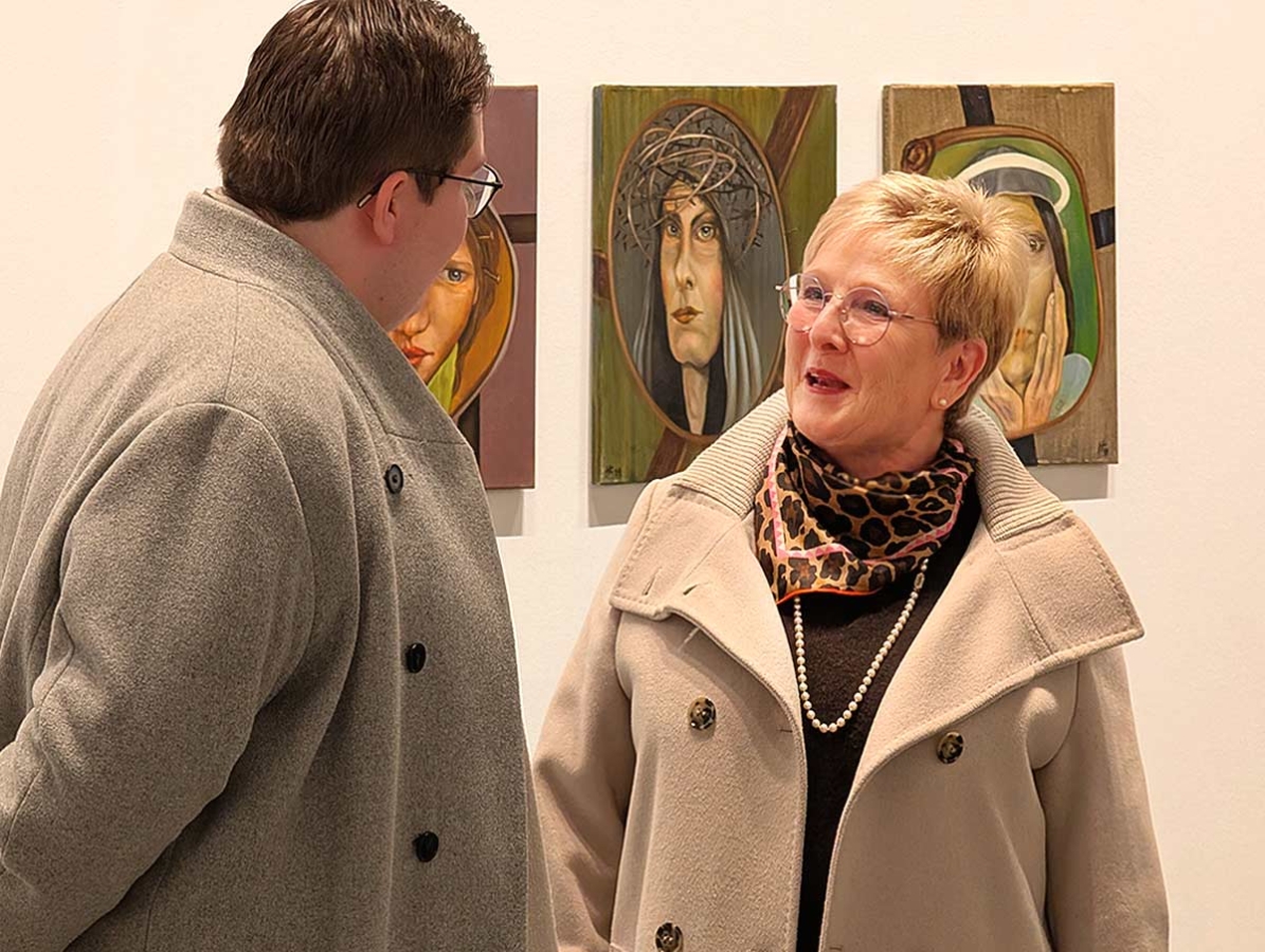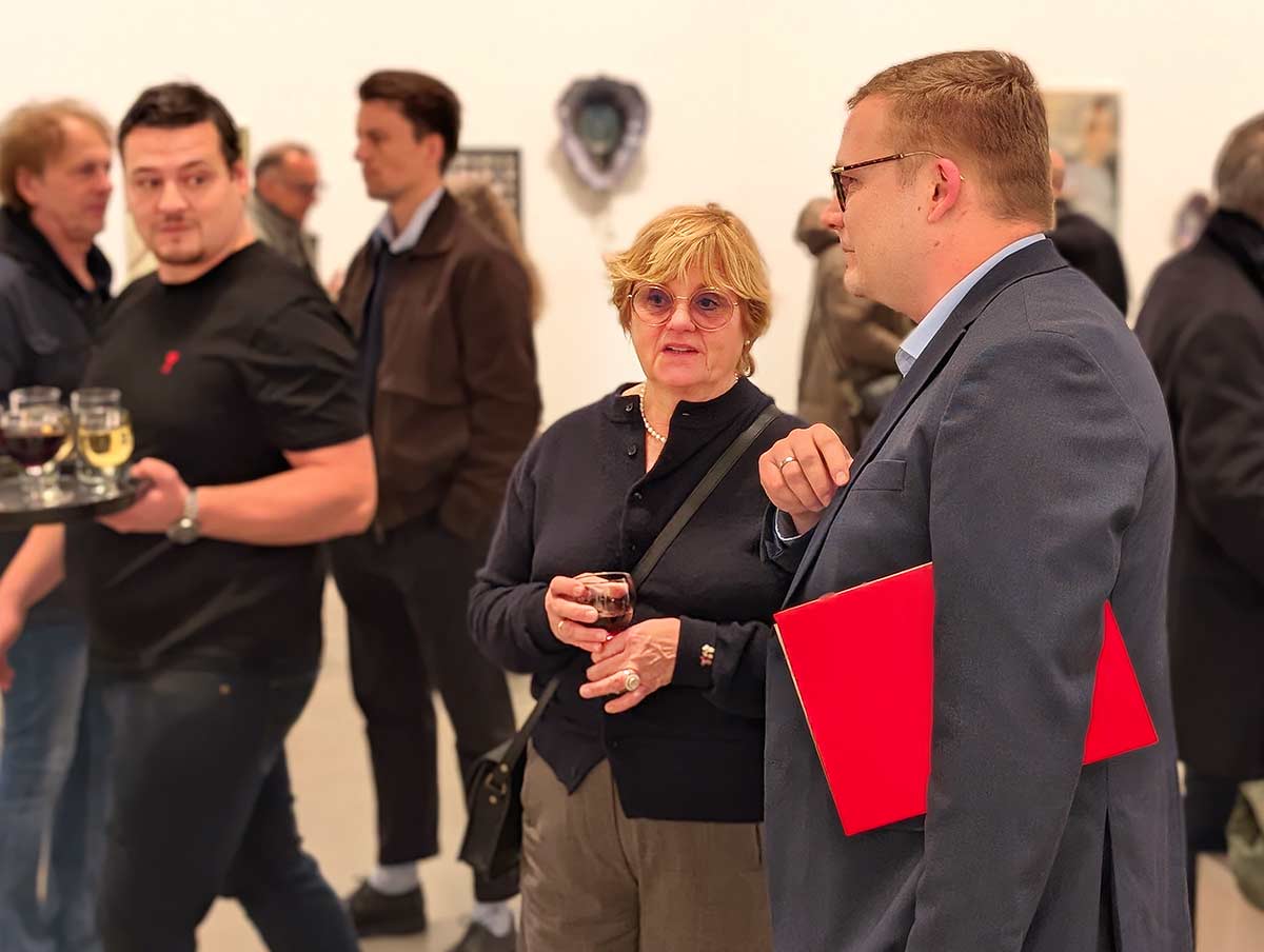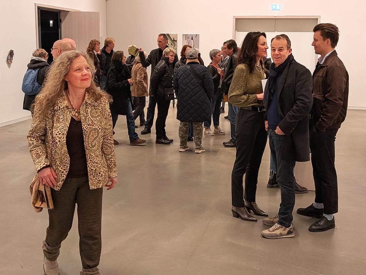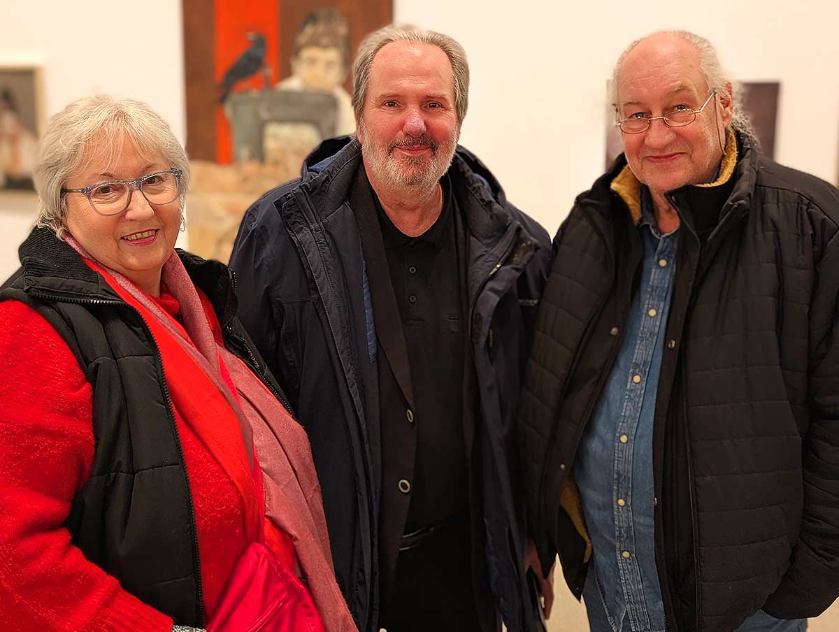 Vor einem Triptychon rätselten einige Gäste, ob Ex-OB Bernd Tischler hier Modell gestanden haben könnte. Die Künstlerin hüllte sich in Schweigen.
