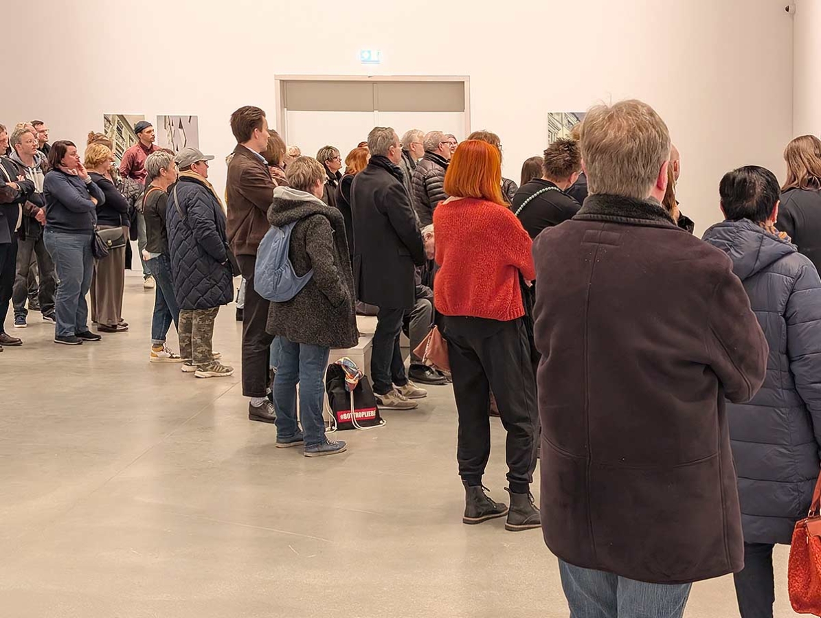 Es folgte eine kurzweilige, gut dirigierte Einführung in die Arbeiten von Heike Feddern, gegeben von Joelle Czampiel von der Ludwiggalerie Schloss Oberhausen. „Auf der linken Seite ersehen wir …“, rief Frau Czampiel, und alle Gäste drehten sich synchron in die angewiesene Richtung – wie bei einer einstudierten Choreografie. Dann eine Drehung nach rechts – und wieder nach vorne. Synchronschwimmen auf dem Trockenen.