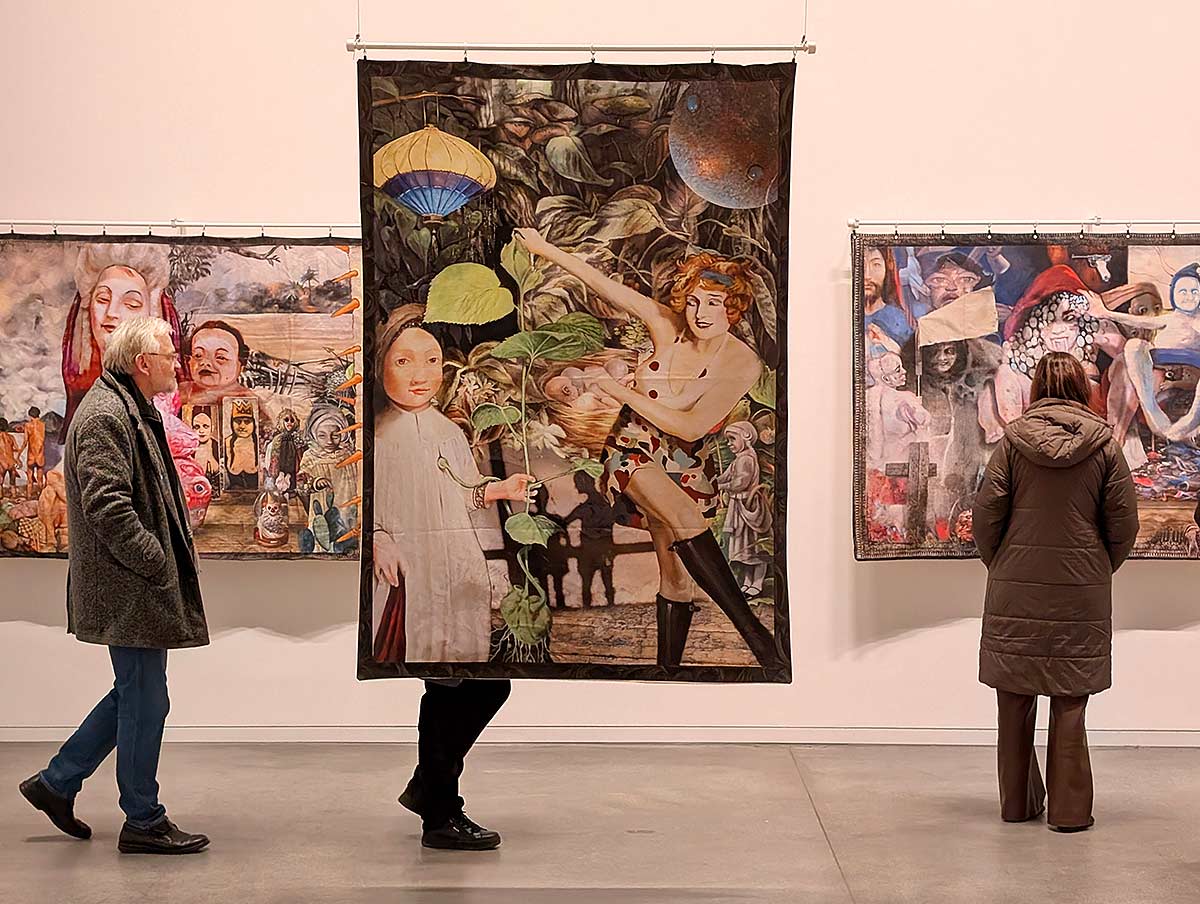Gezeigt werden 37 überwiegend in Öl gemalte Bilder sowie textile und plastische Arbeiten, in denen „Menschen in grotesken Situationen, die sich normal verhalten“ auftreten. Ergänzt wird die Schau durch digitale Collagen auf großen Wandteppichen, die wie ein bunter Zirkus aus Motiven der letzten zehn Jahre wirken. Einige der Arbeiten sind wie Wimmelbilder – Werke, in denen es von kleinen Szenen, Figuren und Objekten „wimmelt“, die jeweils kleine Geschichten erzählen.