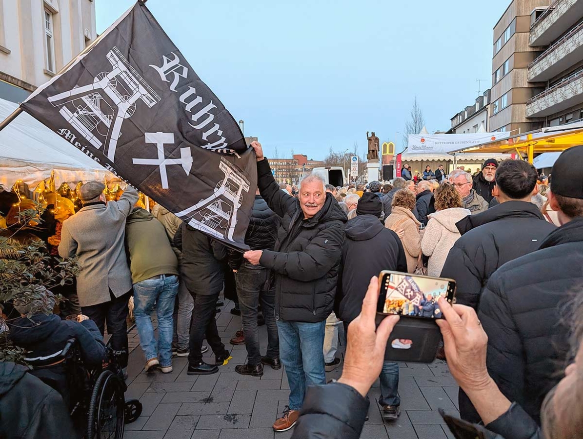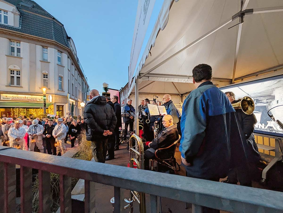 Es wurden alle sechs Strophen des Steigerlieds gesungen. Anschließend ging’s auf der rappelvollen Gastromeile weiter mit Livemusik, Souvenir- und Infoständen, Glühwein und diversen Leckereien, die teilweise von den umliegenden Restaurants dargeboten wurden. Infotafeln des Stadtarchivs, die entlang der Gastromeile platziert waren, erzählten die Geschichte des Bottroper Bergbaus.