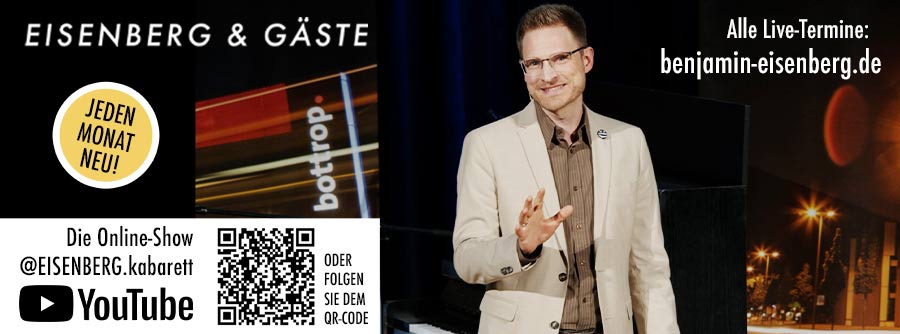 Am 21. und 22. März 2026 präsentiert Kabarettist Benjamin Eisenberg in Zusammenarbeit mit der Ev. Kirchengemeinde Bottrop im Kammerkonzertsaal (Böckenhoffstr. 30, 46236 Bottrop) eine brandneue Show aus der Reihe „Comedy im Saal“. Auch in diesem Jahr wird die Ladies Night in Kooperation mit der Gleichstellungsstelle der Stadt Bottrop zum Internationalen Frauentag aufgeführt.