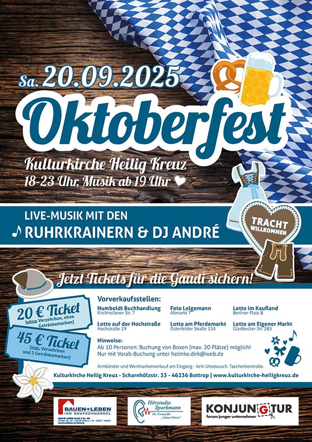 Das dachten sich wohl auch viele Bottroper und feierten am Samstag, dem 21. September 2024, ein zünftiges Oktoberfest in der Bottroper Kulturkirche Heilig Kreuz. Sie genossen Elemente der bayerischen Kultur wie Trachten, bayerische Musik, traditionelle bayerische Speisen (wie Brezn und Weißwurst) und natürlich das berühmte bayerische Bier. Die Kulturkirche wurde für einen Tag zu einem Ort, an dem man bayerische Bräuche und Lebensweise feiern und erleben konnte, garniert mit etwas Ruhrpott-Flair. Ja mei, des war a Gaudi!
